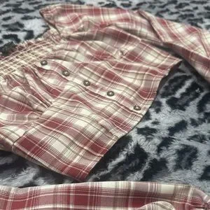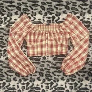 Stylish textured plaid top by Love Tree. Features a burgundy and cream pattern.