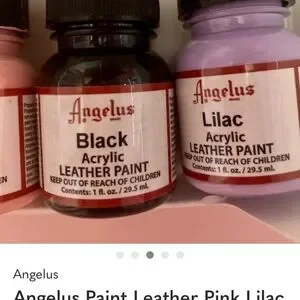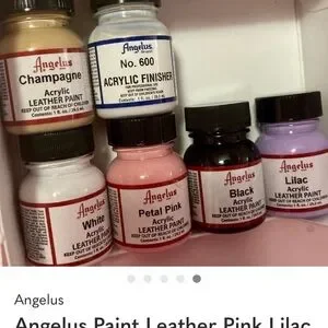 Angelus brand acrylic leather paints. Includes white, petal pink, lilac, black, and champagne. Small jars with screw lids. Great for leather and craft projects.