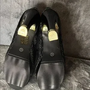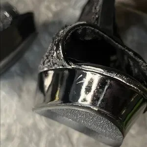 Size 10 Chic black lace peep-toe booties with glossy patent trim and a striking gold-tone block heel. Adjustable ankle strap with buckle for a secure, confident fit. Perfect for evening events and dressy occasions. Comfortable platform and sturdy heel provide balance and style. Blemishes shown in pictures. Does come in original box, box has damage from being opened.