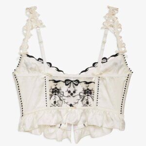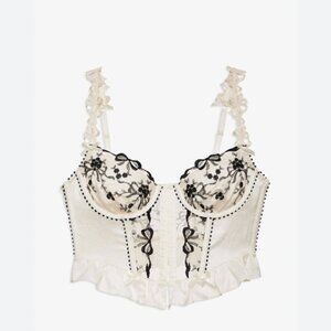 black and white corset top with bow detailing. cups have lining. front hook closure.