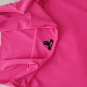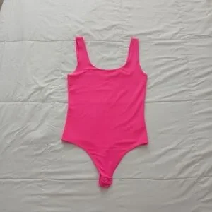 Express wide straps and scoop neckline for simple styling in neon pink. size S. Double layer of fabric. Snap bottom closure, thong cut.