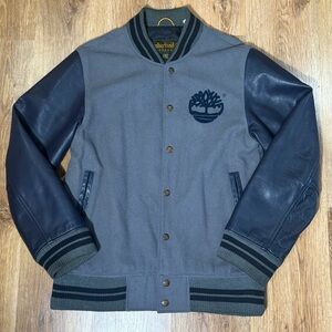 Classic Timberland varsity jacket in two-tone navy and gray. Wool body with navy leather sleeves. Ribbed collar, cuffs, and hem for a fitted silhouette. Embroidered Timberland tree logo on chest. Button-front closure and welt pockets add utility.