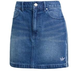 Chic denim mini skirt with signature stripes. Perfect for casual wear. Features iconic Adidas logo.