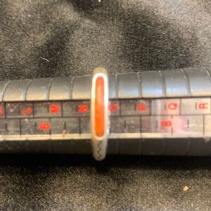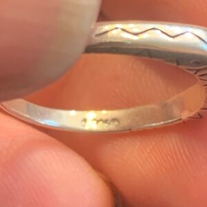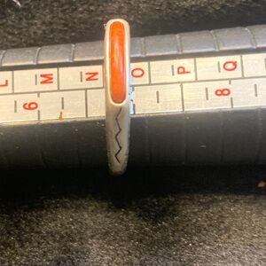 Simple sterling silver band with an orange coral inlay. Subtle engraved detailing on the shoulders. Classic, timeless style. Great for stacking or wearing alone.
