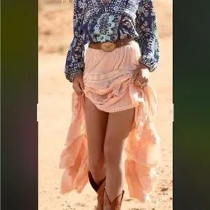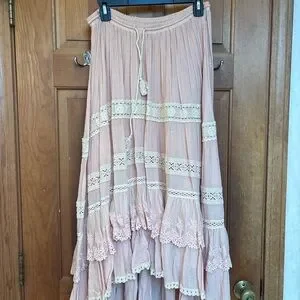 Light peach high-low maxi skirt by Spell. Soft, flowy fabric with subtle tiers.