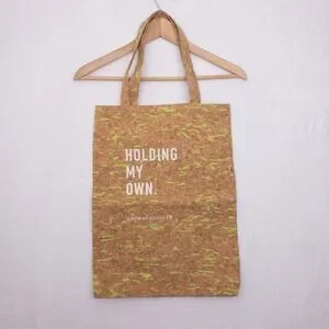 This cork-textured tote bag features a unique neon lime green splatter pattern and "HOLDING MY OWN." graphic text on the front. Designed with a lightweight, eco-conscious aesthetic, this open-top shopper is perfect for daily errands or as a stylish reusable market bag. The interior is unlined with a fabric-blend backing for durability.