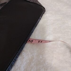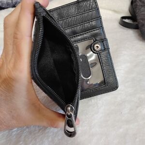 Lined interior, top zipper pocket, ID window, six card slots, two slip pockets