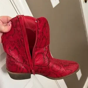 Step out in style with these striking red snake print ankle booties. Perfect for adding a bold touch to any outfit. Size 10 like new $20