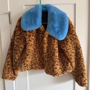 Stylish faux fur jacket in leopard print with a bright blue faux fur collar. Soft, warm fabric for cozy wear. Easy front closure. Perfect for everyday outings and special occasions. No tag. Fits like a S/M