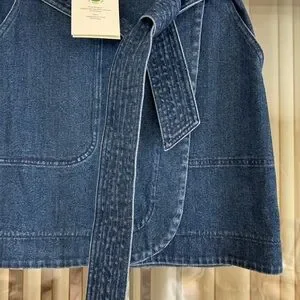 Timeless blue denim skirt by Sezane. Perfect for casual outings. Wrap style with interior button/exterior tie closure. The waist measures approximately 14” across, while the length measures 18” from the top of the shoulder to the bottom hem.