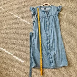 Chambray midi dress with front buttons. Short flutter sleeves and gathered bust. Removable self-tie belt shapes the waist. Clean, casual style for everyday wear.