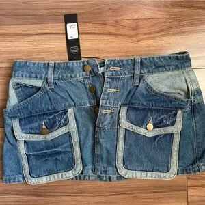 Trendy denim mini skirt by Fashion Nova. Features large front flap pockets with button closures. Double-button waist and subtle contrast stitching. Casual, versatile design for everyday wear.