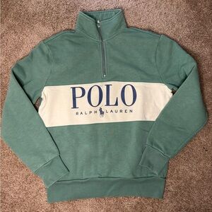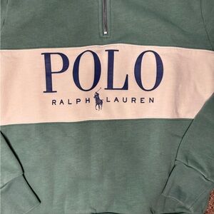 Classic half-zip sweater by Polo Ralph Lauren. Green body with a wide cream center panel. Large navy POLO logo across the chest. Soft knit fabric and ribbed cuffs. Easy to layer for casual looks.