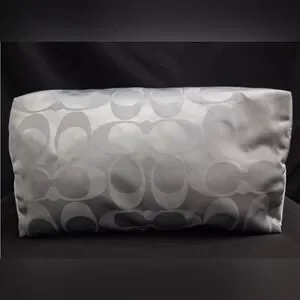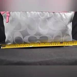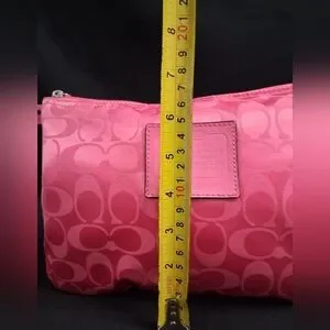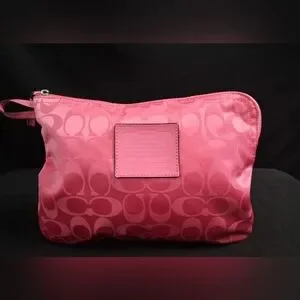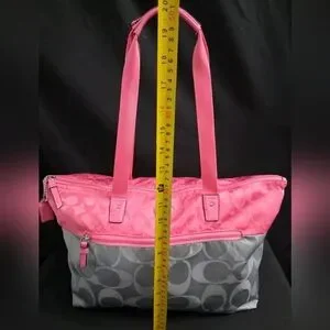 The 3 Piece Coach Signature Nylon Pink & Gray Getaway Weekender Tote/Duffle Bag is a stylish and practical travel accessory. Made from durable nylon with a multicolor exterior featuring pink and gray, this large bag includes a zip closure and pink handles/straps for easy carrying. The duffle style and Coach branding add a touch of sophistication to this versatile piece, perfect for a getaway or weekend trip and any otheroccasion.