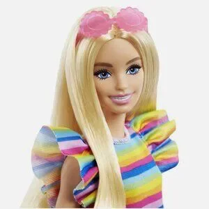 She has blonde hair and an original body type, and makes a colorful statement in a rainbow shift dress with ruffled accent sleeves!