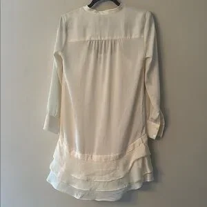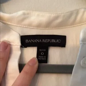 This elegant Banana Republic mini dress showcases a relaxed fit with charming ruffled accents and a sophisticated mandarin collar. Crafted in a soft cream hue, it offers a chic and versatile style perfect for any occasion.