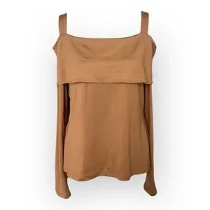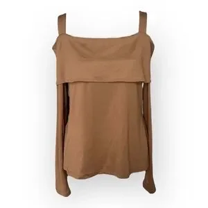 This tan blouse features an elegant asymmetrical design with long sleeves, offering a sophisticated yet comfortable fit. The soft fabric drapes beautifully, making it a versatile addition to any wardrobe.