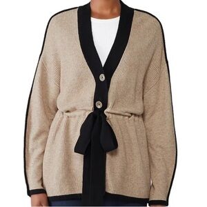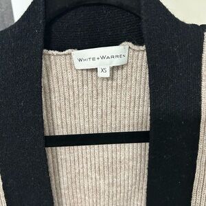 White + Warren Cashmere Cardigan XS Beige Black Trim Open Front Cinched Waist