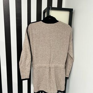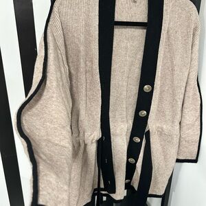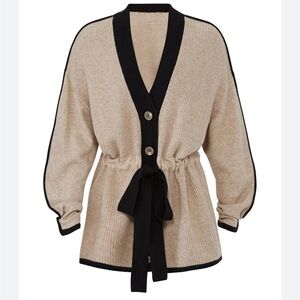 Beautiful beige knit with black trim detailing and cinched waist for a flattering fit