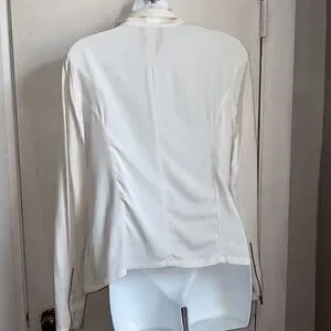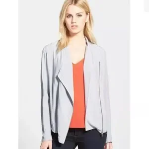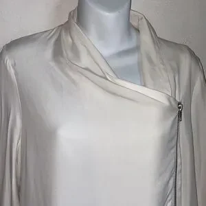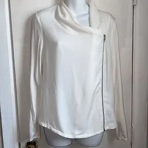 Modal material for a soft luxe feel you can dress up or dress down. Perfect for going from day to night. Assymetrical zip closure, zippers on each cuff, excellent condition. Dry clean. Size small, measures 19” from armpit to armpit and 23” from top of shoulder to bottom hem.