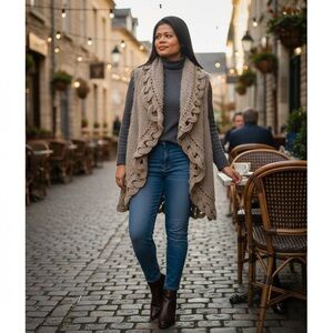 Soft, stylish, and full of texture — this Mono Reno Knitwear taupe open-front vest features a cozy fuzzy knit body with intricate cable knit trim detailing. The scalloped edge design adds a touch of boho charm, making it perfect for layering over long sleeves, dresses, or turtlenecks in fall and winter.