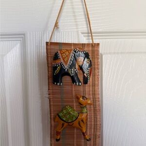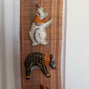 Handcrafted statement piece featuring hand-painted carved animals mounted on a woven textile panel. Rich earthy tones with detailed folk patterns give this a strong global, bohemian, and eclectic home vibe—perfect for gallery walls, entryways, or layered maximalist decor.