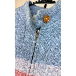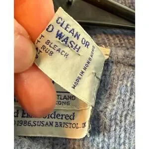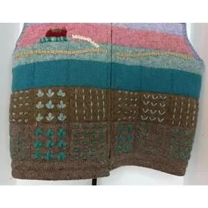 This Vtg Susan Bristol Hand Knit 100% Shetland Wool Sweater Vest from 1986 is a vintage piece of women's clothing in size Large. Made from 100% wool with a Fair Isle pattern, this mid-length sleeveless vest features a zip closure and is suitable for various occasions such as travel, casual outings, and workwear. The multicolor design and bohemian theme make it a stylish choice for the winter, fall, and spring seasons. Perfect for those who appreciate art and 80s fashion, this sweater vest is a unique and timeless addition to any wardrobe.