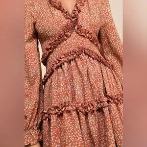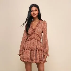 Catch at least a couple compliments with help from the Lulus Admire You Orange Floral Print Ruffled Long Sleeve Mini Dress! This lightweight woven mini dress boasts a ditsy floral print across is ruffle-trimmed V-neckline, long sleeves with elastic cuffs, and ruffled set-in waist. Flared mini skirt is finished off by plenty of trendy tiers. Hidden back zipper/clasp.