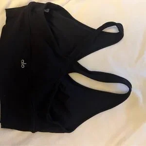 Sleek black sports bra. Soft stretchy fabric. Simple, supportive design. Versatile for workouts or casual wear. No bra pads included