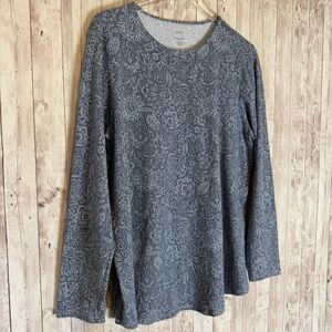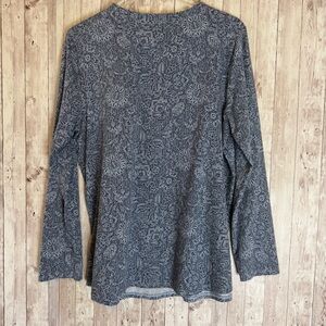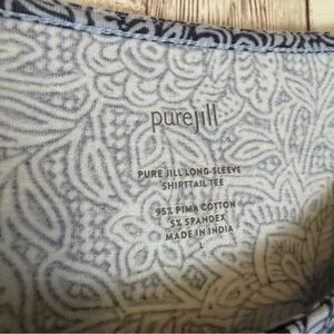 Size large pureJill from J.Jill long-sleeve shirttail tee in a blue woodcut pattern. 95% pima cotton, 5% spandex.