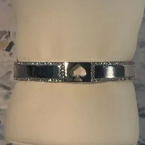 Chic Kate Spade silver-tone hinged bangle bracelet featuring the signature spade logo and sparkling crystal accents. A sleek, minimalist piece that layers beautifully or stands alone.
