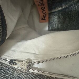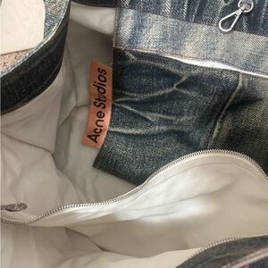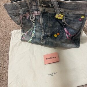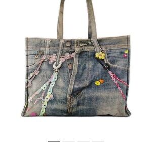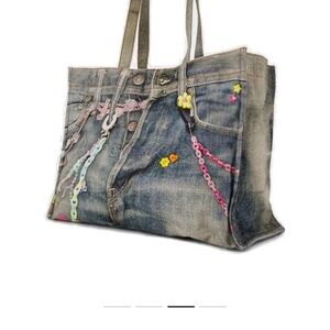 Denim tote with vibrant chain accents. Unique and trendy design.