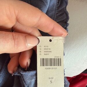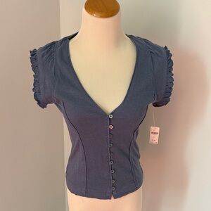 Maeve Navy Button-Front Ruffle Sleeve Top