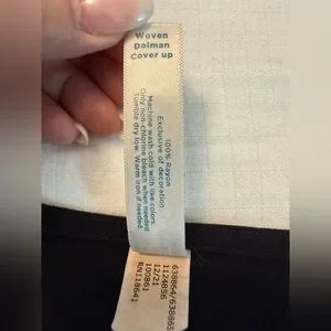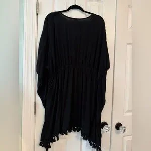 Chic black tunic with a flattering V-neck. Features a drawstring waist and tassel hem. Perfect for versatile styling.