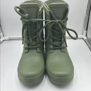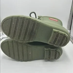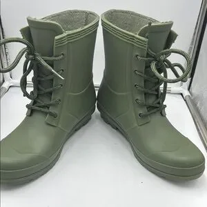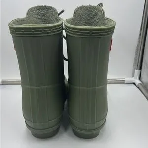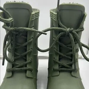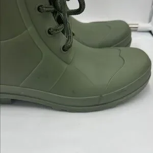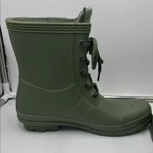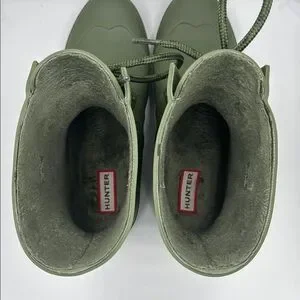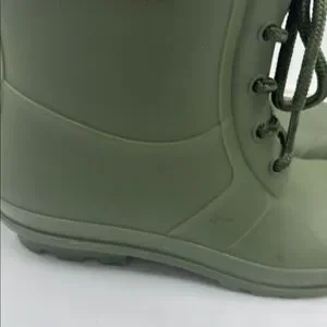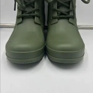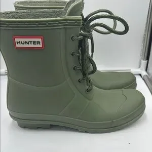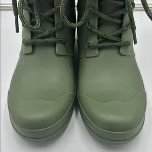 Hunter women's lace-up rain boots in olive. Durable waterproof rubber construction with secure lace-up design. Comfortable fit with gripped sole for wet conditions. Stylish olive color works with outdoor and casual looks.