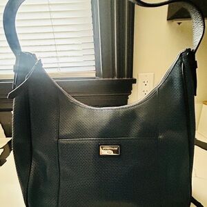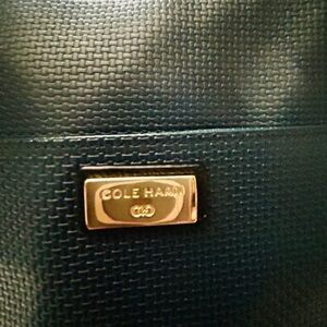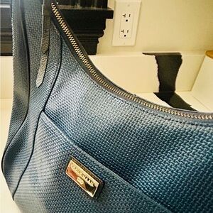 Sleek Cole Haan shoulder bag in textured blue leather. Top zip closure and single shoulder strap. Front logo plaque adds subtle branding. Structured silhouette for everyday use.