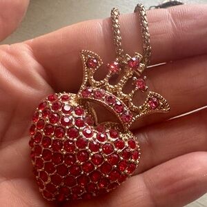 Elegant heart pendant encrusted with pink crystals. Feminine crown detail above the heart adds a regal touch. Plated chain complements the pink stones for a cohesive look. Perfect for gifting or daily wear.