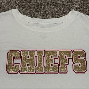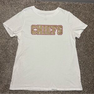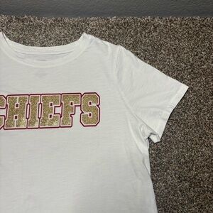 Short sleeve white tee. Bold 'Chiefs' graphic in red and gold shiny, Casual and stylish. Good Condition please check photos for measurements