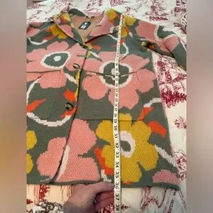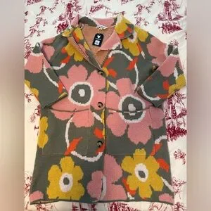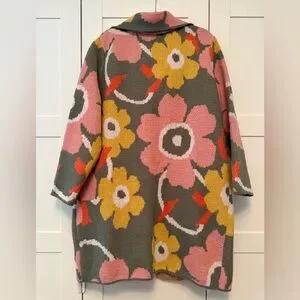 Bold floral knit coatigan in grey/green base. Large pink and yellow flowers create a playful print. Button-front closure and longline silhouette. Soft textured knit for comfortable layering. Vibrant statement piece for casual looks and cozy style. New with tags. Last photo is a stock photo that I found of this sweater in a different color way.