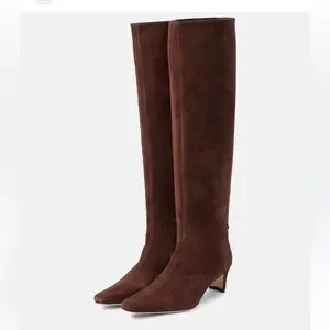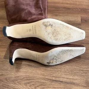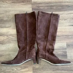 Elegant brown suede knee-high boots. Sleek design with a pointed toe. Perfect for stylish outings. Worn one time, they’re too small for me- I’m in between a 9-10 shoe and these definitely run on the small side!