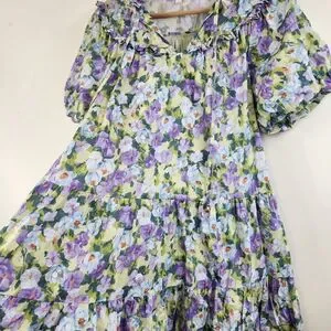 Charming floral dress by Entro. Features a vibrant purple and green pattern. Short puff sleeves and a ruffled hem add a playful touch.