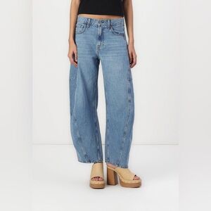 Stylish medium blue barrel jeans. Perfect for casual wear.