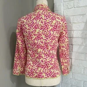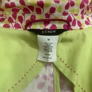 I.Crew Stylish blazer featuring a vibrant pink and yellow leaf print. Lightweight tailored silhouette with notched collar and single-button front. Contrasting yellow trim for a polished finish. Versatile jacket ideal for dressing up or layering. Excellent condition and closet kept in a smoke free home.
