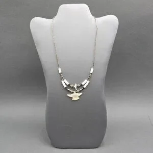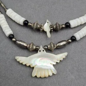 Embrace the spirit of the High Desert with this stunning vintage Southwestern fetish necklace. Featuring 2 hand-carved Mother of Pearl birds that shimmer with an iridescent glow, this piece is expertly strung with traditional white shell heishi beads. Each bird is uniquely shaped, creating an heirloom-quality aesthetic that feels both organic and elegant—a true statement of indigenous-inspired artistry.