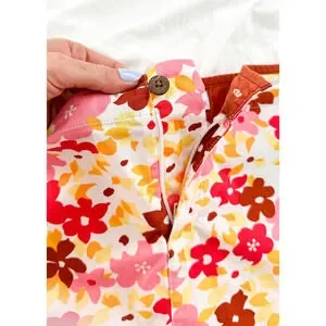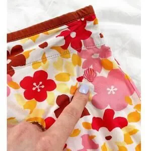 DETAILS: adorable mid-2000s skirt from Patagonia features an all over flower print in shades of red, rust, pink and yellow. Has a wooden button and zipped fly as well as a pocket on the right side.