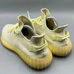 Beige knit upper with light yellow laces. Sleek and modern design.
