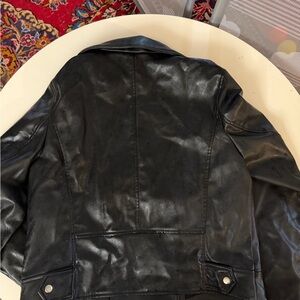 Stylish black leather jacket. Features zippered pockets and classic biker design. Perfect for any occasion.