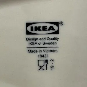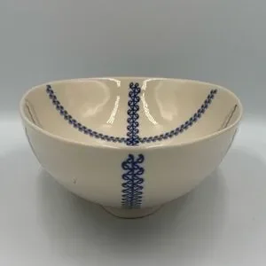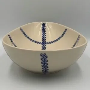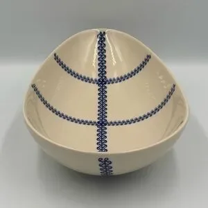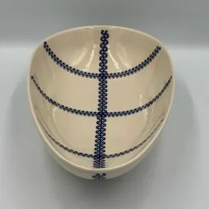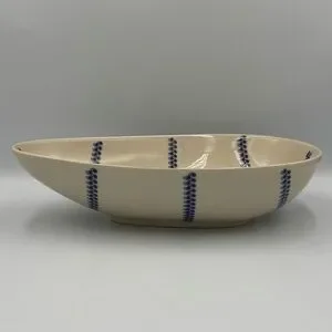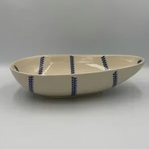 Large Egg Shaped Serving Bowl from IKEA #18431 Ivory with a navy blue striped pattern. 11.75”x7”x2.75”