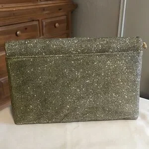 This NWT a new day clutch/crossbody bag has a snap envelope closure, gold chain strap, and an interior zipper pocket. The shimmery bag is made of 60% recycled polyester. Measurements 6.4” X 9.5” X 1”. The strap length is 48”. The bag is in pristine condition.