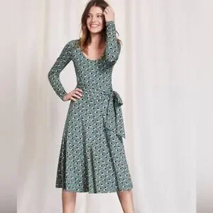 Boden Silvia faux wrap jersey knit dress in size 12 regular. Color is a lovely dark seafoam green with burgundy floral pattern.